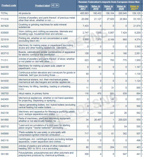 附:2022年前俄羅斯從歐洲進口主要商品排名情況