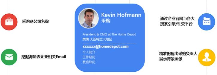 通過(guò)采購(gòu)商公司名稱、企業(yè)官網(wǎng)與各大搜索引擎/社交平臺(tái),挖掘海量該企業(yè)相關(guān)Email。通過(guò)對(duì)郵箱所有人在平臺(tái)上的社交行為和數(shù)據(jù),進(jìn)而精準(zhǔn)定位分析出其對(duì)應(yīng)的職位信息,進(jìn)而確定外貿(mào)合作的精準(zhǔn)負(fù)責(zé)人。