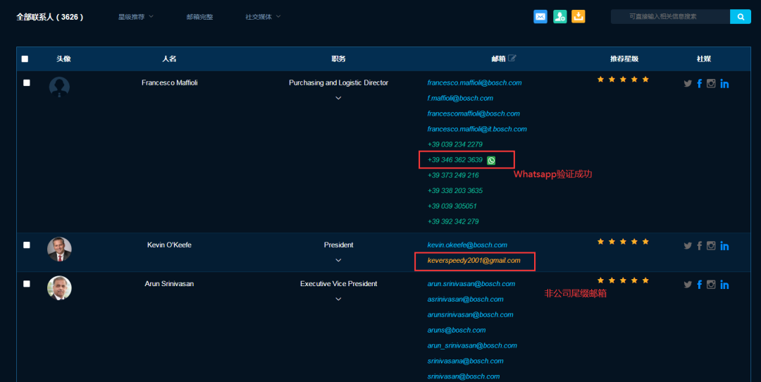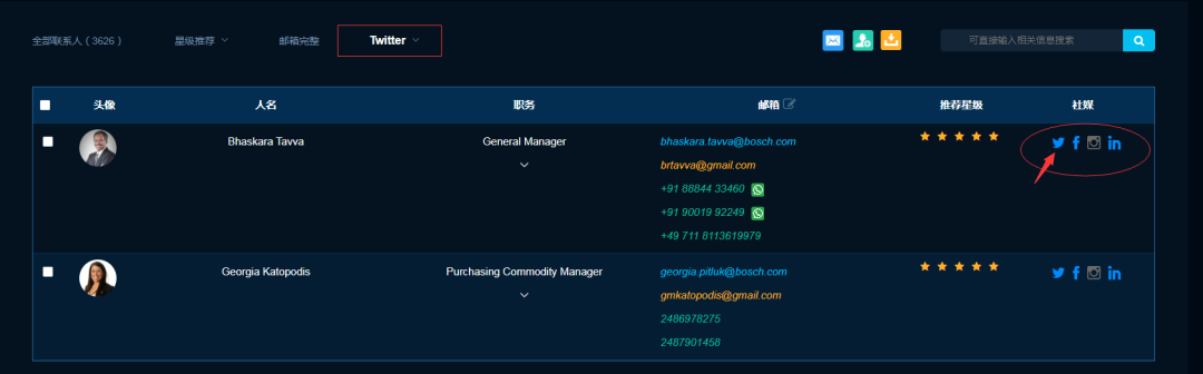 四.企業(yè)精準(zhǔn)聯(lián)系人社媒信息 新增推特,點(diǎn)擊社媒圖標(biāo)可以直連個(gè)人社媒主頁,獲取更多內(nèi)容。