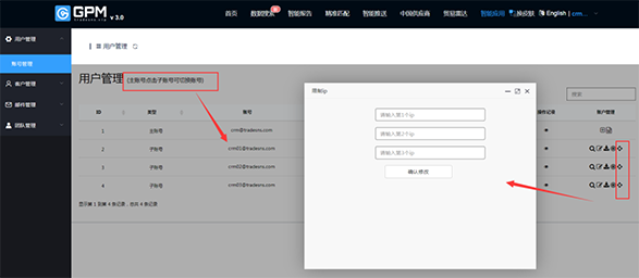 賬號管理跟之前是一樣的,有兩個不同。首先保留了之前角色切換的這個功能,在這個位置主賬號點擊子賬號可以切換到他的角色。然后第二個新增了一個功能,新增登陸賬號的IP限制(最多3個),主賬號可以限制這個子賬號登錄的ip,也就是最多我們可以設(shè)置三個ip。比如:員工可以在公司、在家或者常用的辦公地點,才可以登錄我們的這個系統(tǒng),如果出到了這個ip之外的話,它就上不去了。