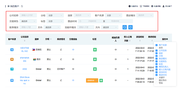 (1)在客戶列表中,可以根據(jù)表格字段進(jìn)行高級篩選,快速高效找到目標(biāo)客戶群體。