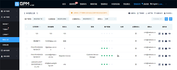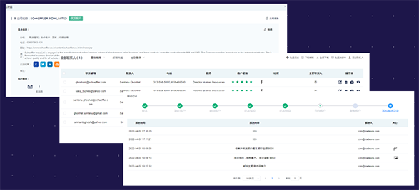 那么本次我們新增了一個聯(lián)系人表,這個是之前用戶需求比較多的,他們想要一個集合的所有的聯(lián)系人的一個表的位置。那么聯(lián)系人表就是所有收藏客戶中的聯(lián)系人的一個匯總情況。然后我們可以進(jìn)行一個在線的編輯修改,然后可以批量添加,也支持一鍵下載,群發(fā)郵件。