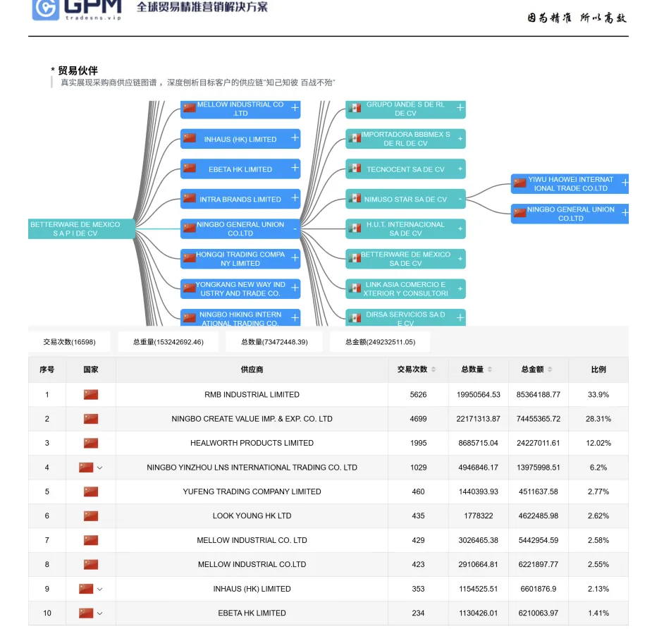 1.GPM精準(zhǔn)匹配: 基于全球貿(mào)易數(shù)據(jù),基于全球貿(mào)易數(shù)據(jù),神經(jīng)元信息網(wǎng)絡(luò)和智能拓?fù)湎到y(tǒng)同時(shí)發(fā)力,結(jié)合易之家獨(dú)有的國際貿(mào)易專用大語言模型,在海量繁雜數(shù)據(jù)里,一鍵為您匹配最符合您客戶畫像的海外采購商,從源頭上確??蛻舴较虻恼_性。