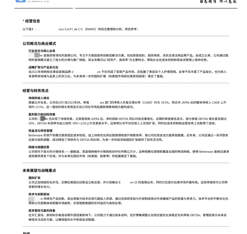 深度對的指定公司進(jìn)行詳細(xì)的背景調(diào)查:(如基本信息, 經(jīng)營狀況,關(guān)鍵聯(lián)系人KP, 企業(yè)動(dòng)態(tài)等信息)讓你知道你聯(lián)系的是真正的終端客戶, 而不是各種比價(jià)壓價(jià)的經(jīng)銷商, 為企業(yè)提供精準(zhǔn)營銷切入點(diǎn)。