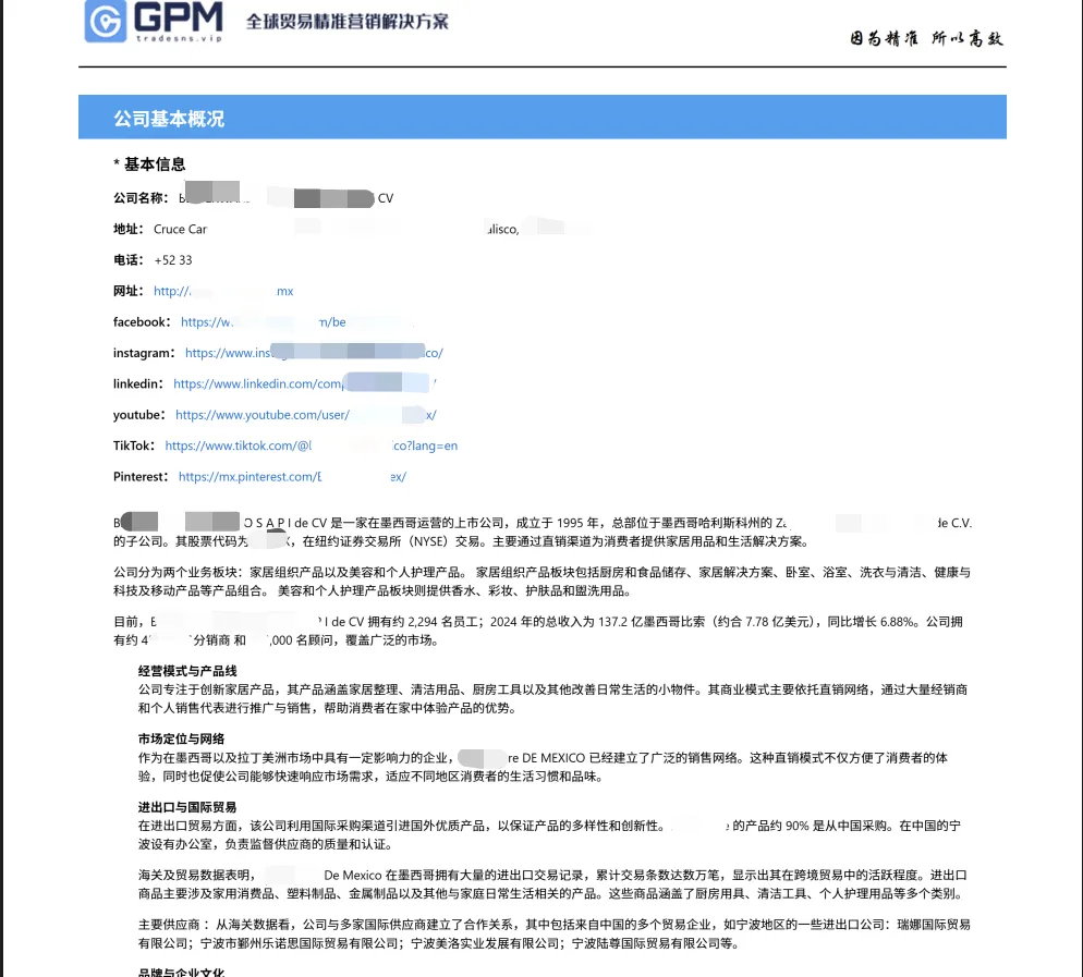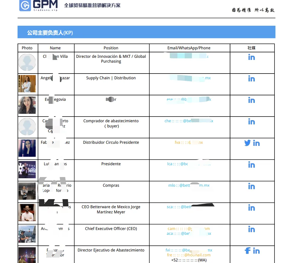 GPM系統(tǒng)可選擇對方職務(wù), 精準(zhǔn)聯(lián)系上采購商采購負(fù)責(zé)人或企業(yè)高管的郵箱、電話、社媒,讓你找準(zhǔn)對的人=定制報(bào)告的精準(zhǔn)KP定位,更是介入了人工核對,讓您每一次溝通都能高效觸達(dá)核心KP