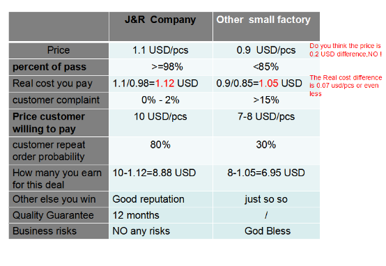 既然有其他供應(yīng)商能達(dá)到目標(biāo)價(jià)為什么不選呢,那肯定是有原因的嘍,比如品質(zhì)原因或者是可能客戶(hù)故意嚇唬你一下,因?yàn)槲覀兒艽_信我們的報(bào)價(jià)是非常合理的,而且本身給新客戶(hù)的價(jià)格已經(jīng)是非常優(yōu)惠的。 長(zhǎng)話短說(shuō),上重點(diǎn):